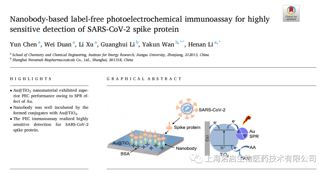 2022年5月3日,mile米乐集团生物和江苏大学化学化工学院李赫楠教授团队合作,在《Analytica Chimica Acta》发表了题为“Nanobody-based label-free photoelectrochemical immunoassay for highly sensitive detection of SARS-CoV-2 spike protein”的研究论文。mile米乐集团生物万亚坤博士和李贺楠教授为并列通讯作者,相关纳米抗体的知识产权归mile米乐集团生物所有。